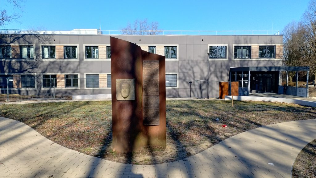 Das Bonhoeffer-Denkmal auf dem Vorplatz des Ausweichgeländes für das Johannes-Rau-Gymnasium auf der Hardt.